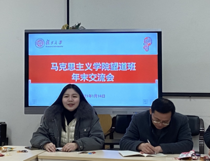 最后,辅导员陆婷婷从学习、工作和生活三个方面总结了本学期班级建设的总体情况,分析班级建设中存在的不足,并提出了具体的提升措施。为促进本科生更好融入大学生活,学院下步还将继续举办“笃信”领学计划、“致远”实践计划等活动,切实提高望道班本科生学习马克思主义理论的能力和水平。