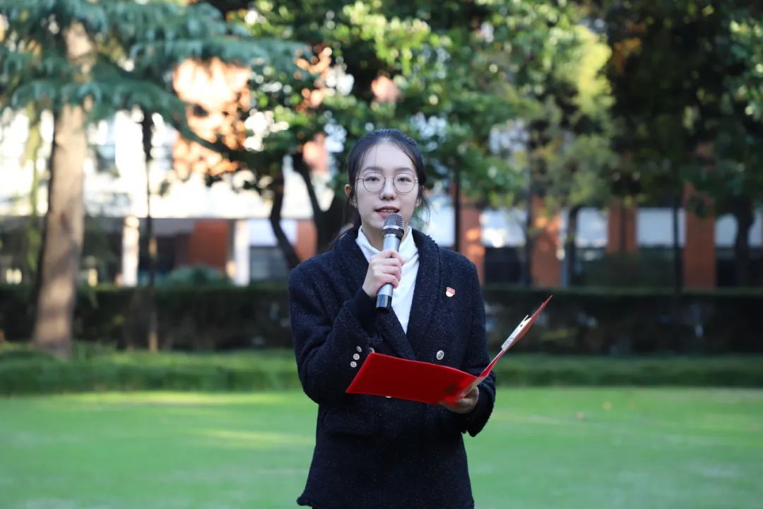 乐声渐停,国旗高扬。2023级硕士研究生徐希瑶同学作国旗下发言。她从三个方面与同学们分享如何树立学术报国之志:一是要在马言马,在马信马,做坚定信仰的传承者;二是要日码三百,步履不停,做脚踏实地的求索者;三是要学思践悟,知行合一,做矢志拼搏的奋斗者。最后,她号召大家在服务“国之大者”的奋斗征程中迸发青春能量。