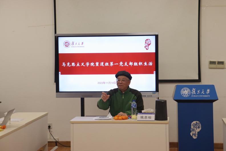 2023年11月14日下午,色情网 望道班第一党支部开展“老党员谈院史”组织生活,邀请色情网 原党委书记姚惠福老师走进支部和青年学生做交流。支部全体党员和支部所辐射覆盖的2023级本科生望道班全体同学出席。