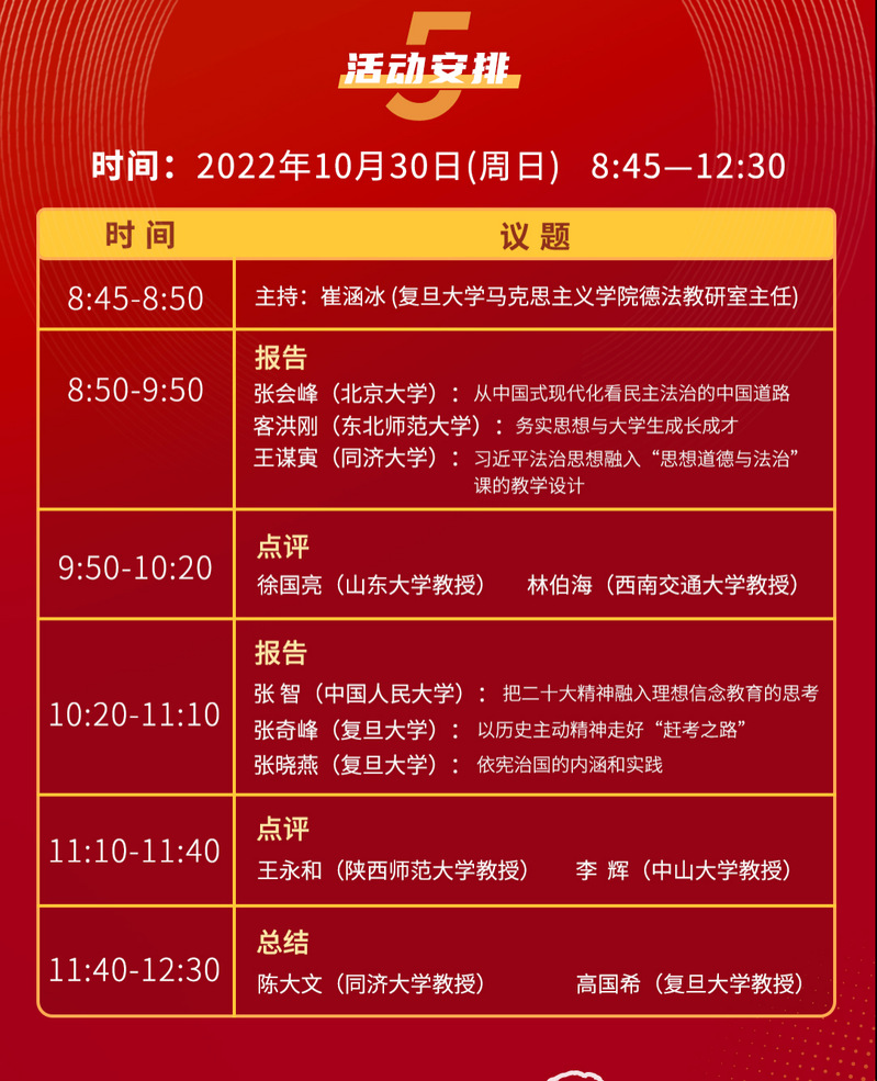 在总结环节中,教育部高校“思想道德与法治”分教指委副主任、同济大学色情网 陈大文教授对二十大报告中的法治思想及其教学研究作了补充与强调。陈大文教授表示,全面依法治国是关乎国家治理的一场深刻革命,关系到我们党执政兴国、人民幸福安康以及党和国家长治久安,因此必须更好地发挥其固根本、稳预期、利长远的保障作用,这也对法治的作用领域及自身内涵的不断丰富拓展提出了要求。如此,对于教学实践而言,思政课教师不仅要讲述教材及现有的理论文本,还要密切关注理论与实践动态,尤其要结合习近平法治思想的最新实践成果,立足实践,结合现实,以更好地展望未来、走好中国法治建设的未来之路。