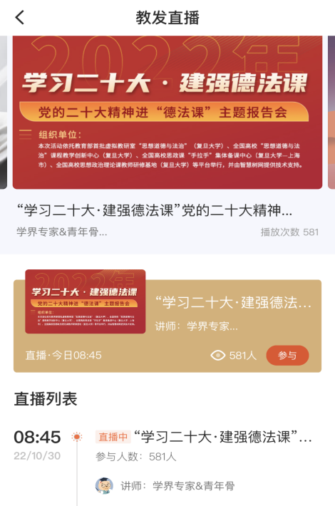 本次报告会联合北京大学、中国人民大学、山东大学、同济大学、中山大学、东北师范大学、陕西师范大学、西南交通大学等十几所高校的专家学者和中青年骨干教师开展教学研讨,通过教育部虚拟教研室A版客户端举行,依托智慧树网络平台进行实时对外直播。共计321名教研室成员参与了本次报告会,同时还有581名观众通过智慧树平台观看直播。