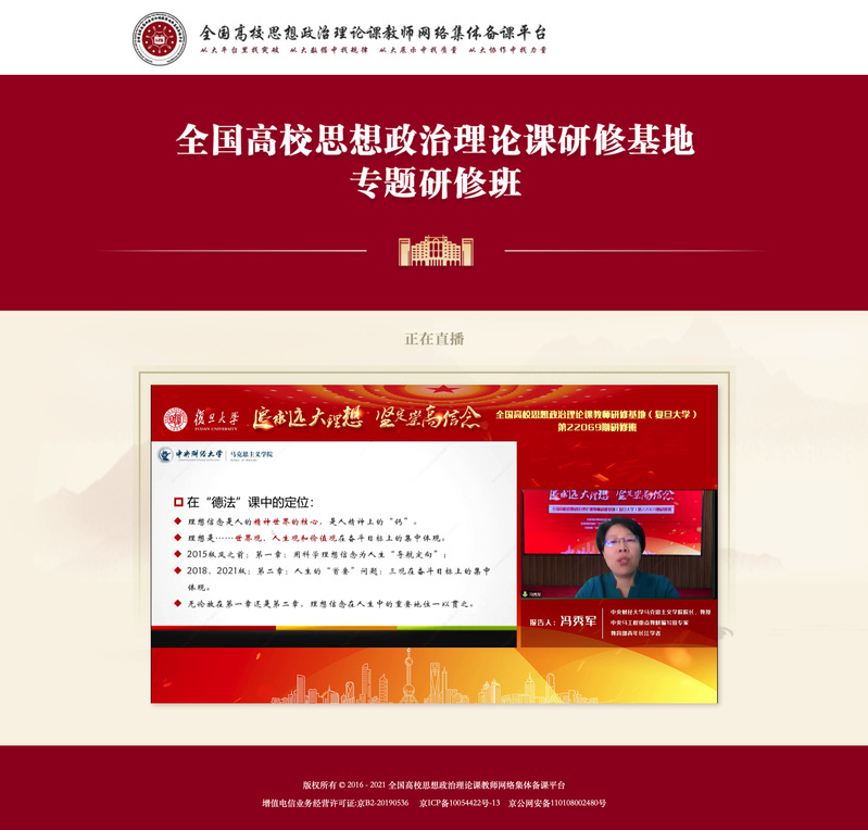 本期培训班的相关课程在教育部基地研修平台同步直播,全国各高校思政课教师在线上参加研修培训。