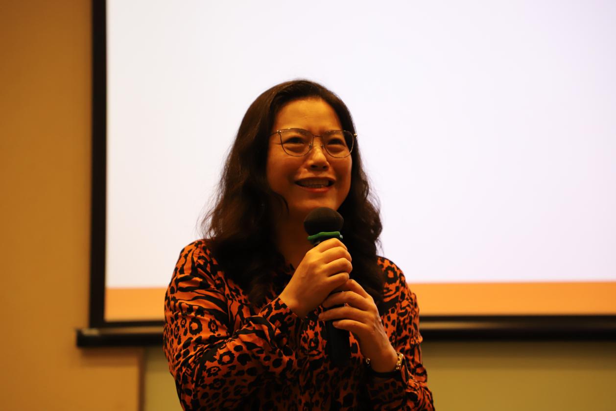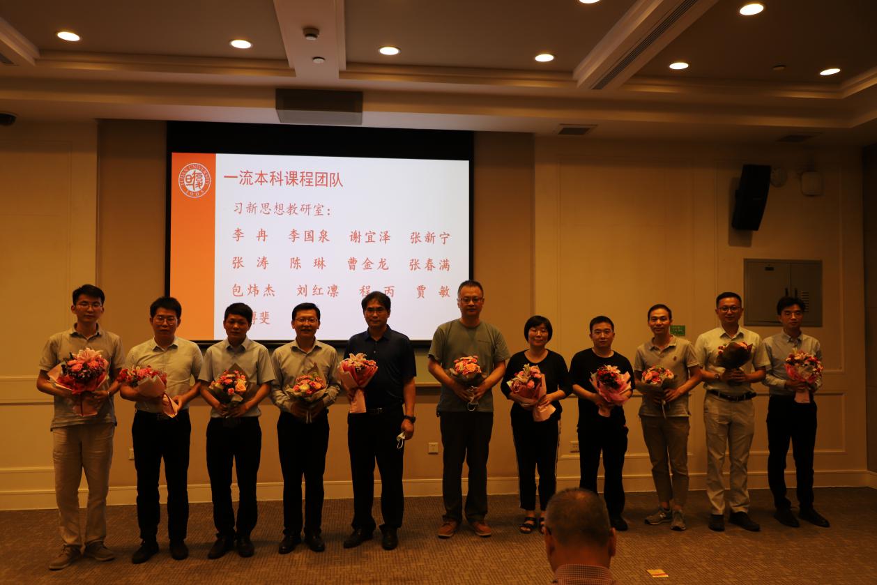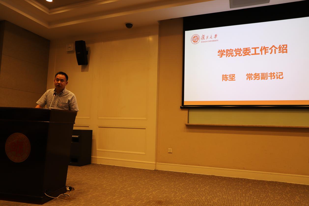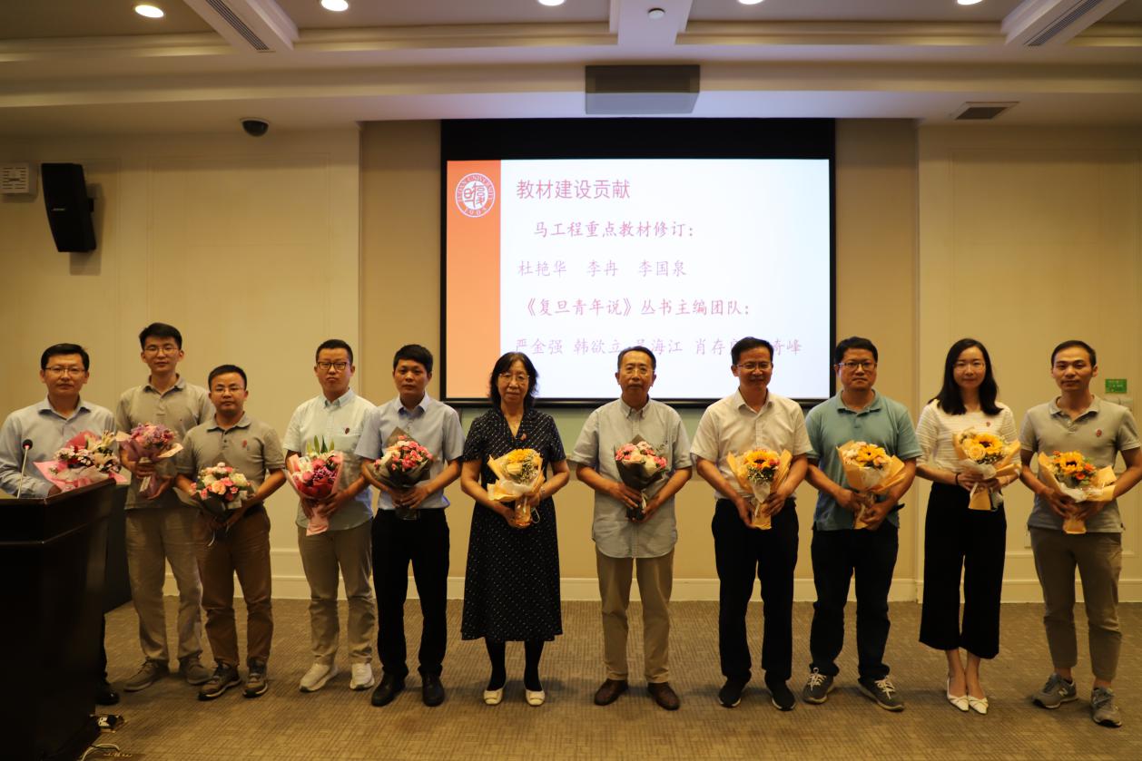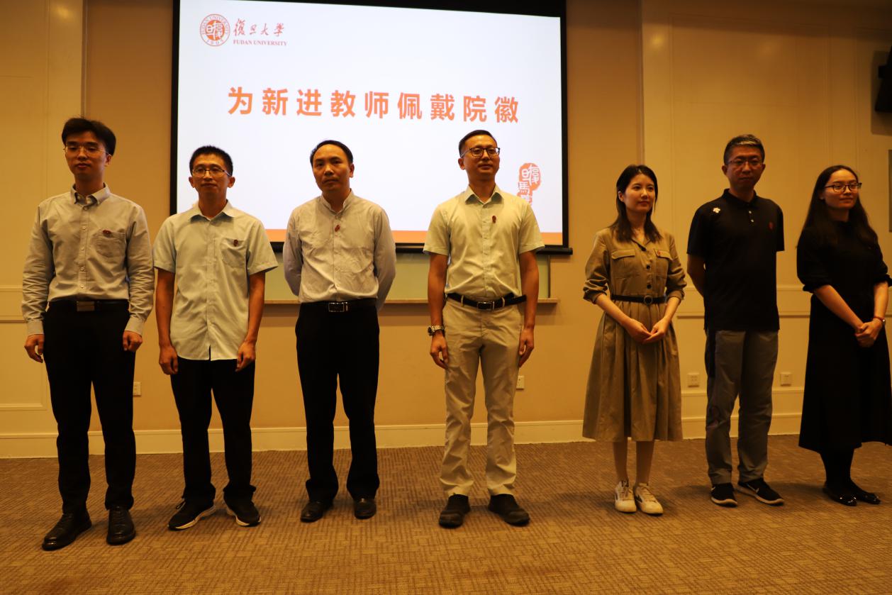 李冉首先宣读2021年新进教职工名单,欢迎他们加盟复旦马院,各学科带头人和办公室主任为新进教职工佩戴院徽。