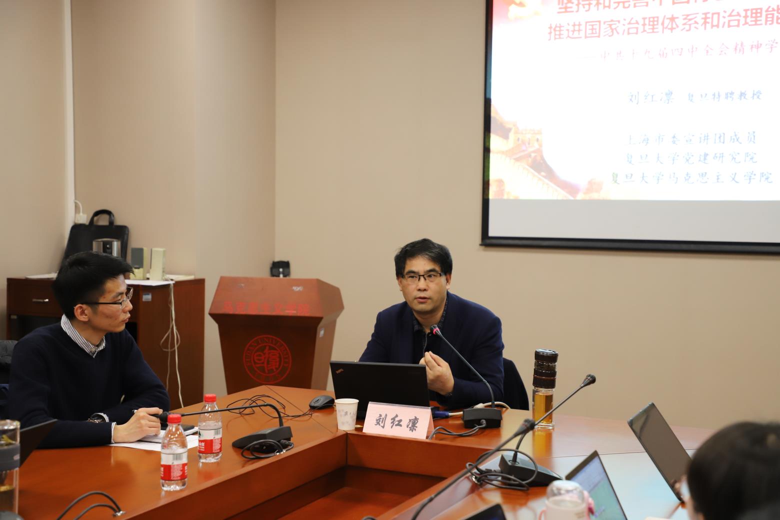 至此,成立大会圆满落下帷幕。随后 色情网 特聘教授、党建研究院院长刘红凛老师为讲师团成员进行第一次培训,培训会由望道学生讲师团团长包炜杰主持。刘红凛老师针对此次培训首先谈到了自己的几点感想,如学深悟透才能讲好、理论彻底才能服人。接着刘红凛老师以十九届四中全会精神学习解读为例,展开了一堂系统全面、生动详实的培训课。培训课既涉及到十九届四中全会的主要概况、核心内容、起草过程、重大意义等方面的内容,又穿插了许多真实有趣的案例,引发在场同学的极大共鸣。