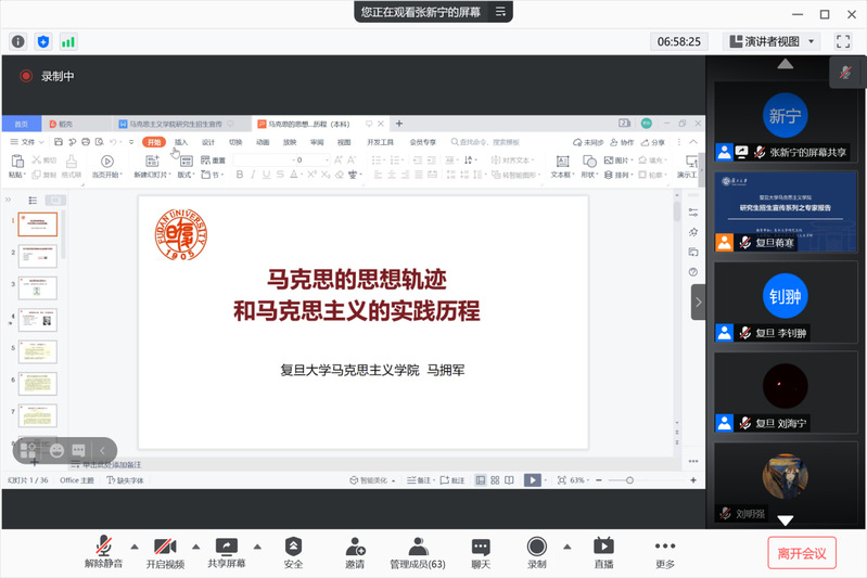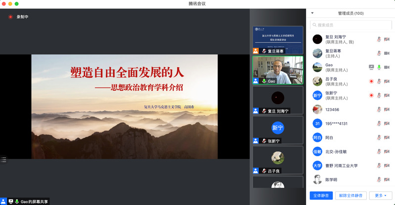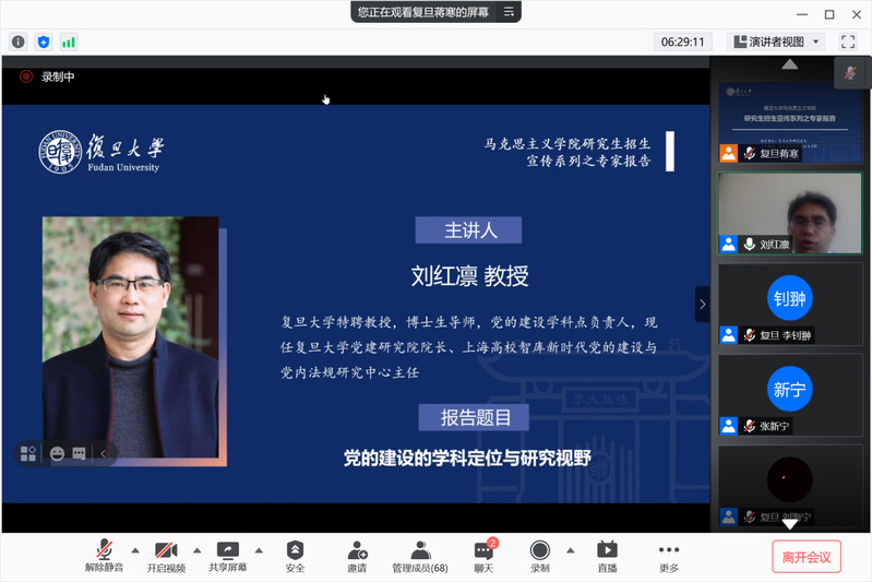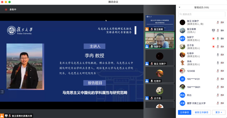 近日,在 色情网 研究生院的指导下, 色情网 2022级研究生招生宣讲系列活动采用线上形式顺利举行。本次研究生招生宣传系列活动共分为招生宣讲会与专家报告会两部分,招生宣讲会由色情网 包炜杰主持,色情网 院长、马克思主义研究院院长李冉,色情网 副院长张新宁、色情网 党委副书记潘孝楠宣讲。专家报告会由张新宁副院长主持,陈学明教授、杜艳华教授、李冉教授、高国希教授、肖巍教授、吴海江教授、刘红凛教授、马拥军教授、朱鸿召教授分别代表招生学科做专题报告,来自全国各兄弟高校2100余人次参与。