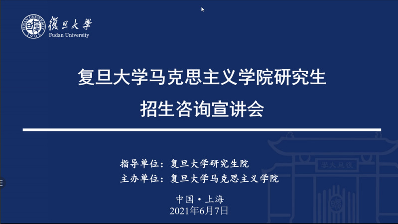 在招生宣讲会上,李冉院长作了题为“选择复旦马院就是选择光明的未来”的报告,重点介绍了学院历史、师资队伍、科研平台、学科建制等内容,并向同学们分享了复旦马院的培养目标,即“培养马克思主义理论家的好苗子、培养马克思主义教育家的好胚子、培养马克思主义政治家的好种子”。张新宁副院长围绕研究生招生和培养情况作报告,从学院学科点设置与学科评估情况、2022年硕博士研究生招生方向与近年来招生数量变化趋势以及招生生源、规模和结构特点等方面作了重点分享。潘孝楠副书记重点介绍了学院学生工作情况,向同学们传递了复旦马院“学马信马,在马言马”和“学思想、懂理论、敢担当”的理念,介绍了望道学生讲师团等理论宣讲团体建设,以及学院“泮林望菁”研究生科研计划和“小马过河”博士生工作坊等交流平台。