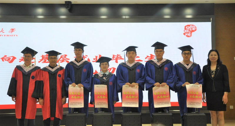 党委书记许征老师、副书记孙谦老师、副院长肖存良老师向赴基层就业和任思政教员的毕业生赠送纪念品。印有“追望大道,不忘初心”的海报和印有“立德树人”的折扇 ,表达学院对毕业生坚守爱国爱民情怀、坚守励志进取情怀、坚守求真明理情怀、坚守知行合一情怀的深深期许和殷殷嘱托。