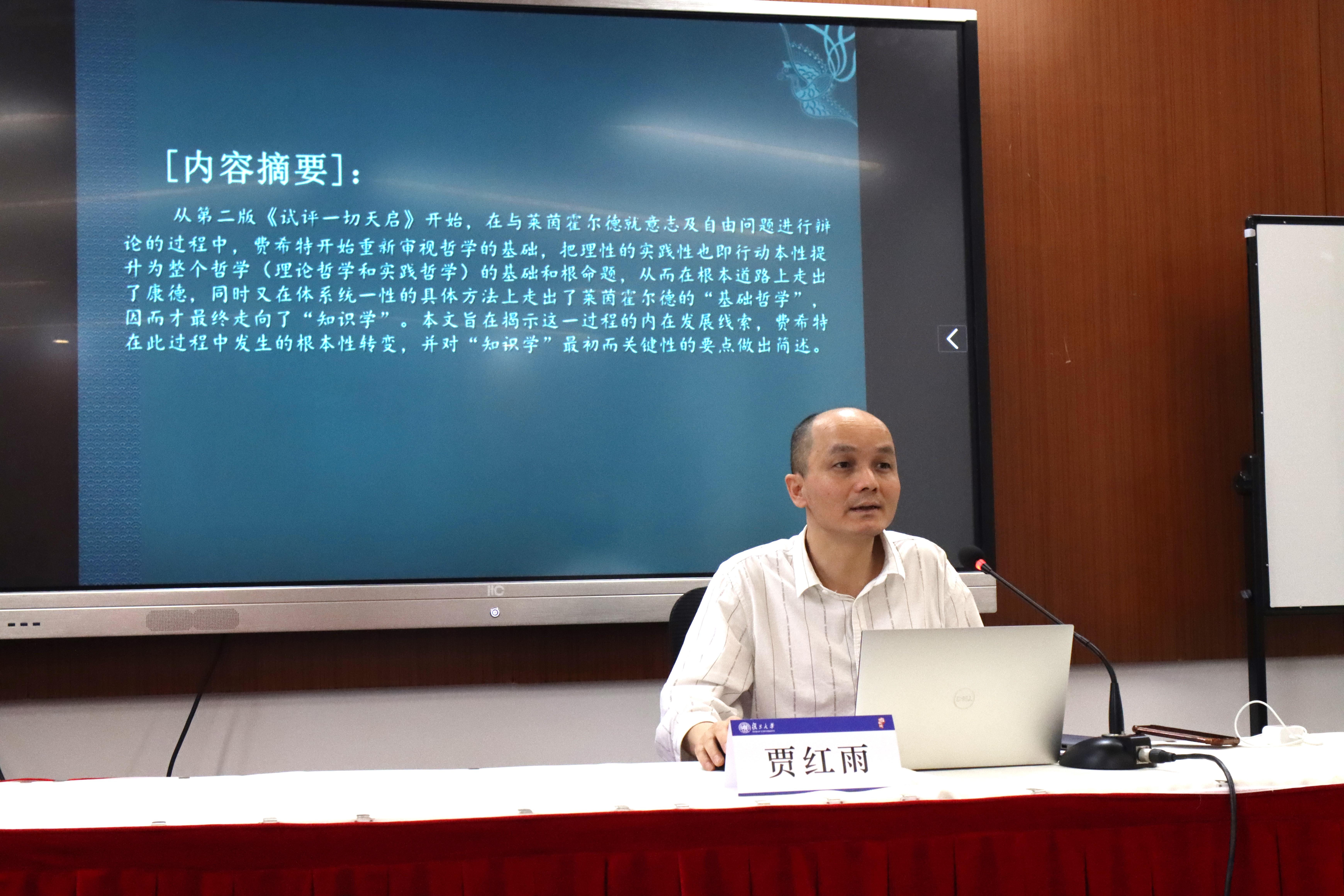 随后,长安大学色情网 的贾红雨副教授基于“费希特知识学的发端”进行报告。贾老师试图揭示费希特在根本道路上走出康德,在体系统一性的具体方法上走出莱茵霍尔德的基础哲学并最终走向知识学这一过程的内在发展线索与根本性转变,并对知识学最初而关键性的要点做出简述。