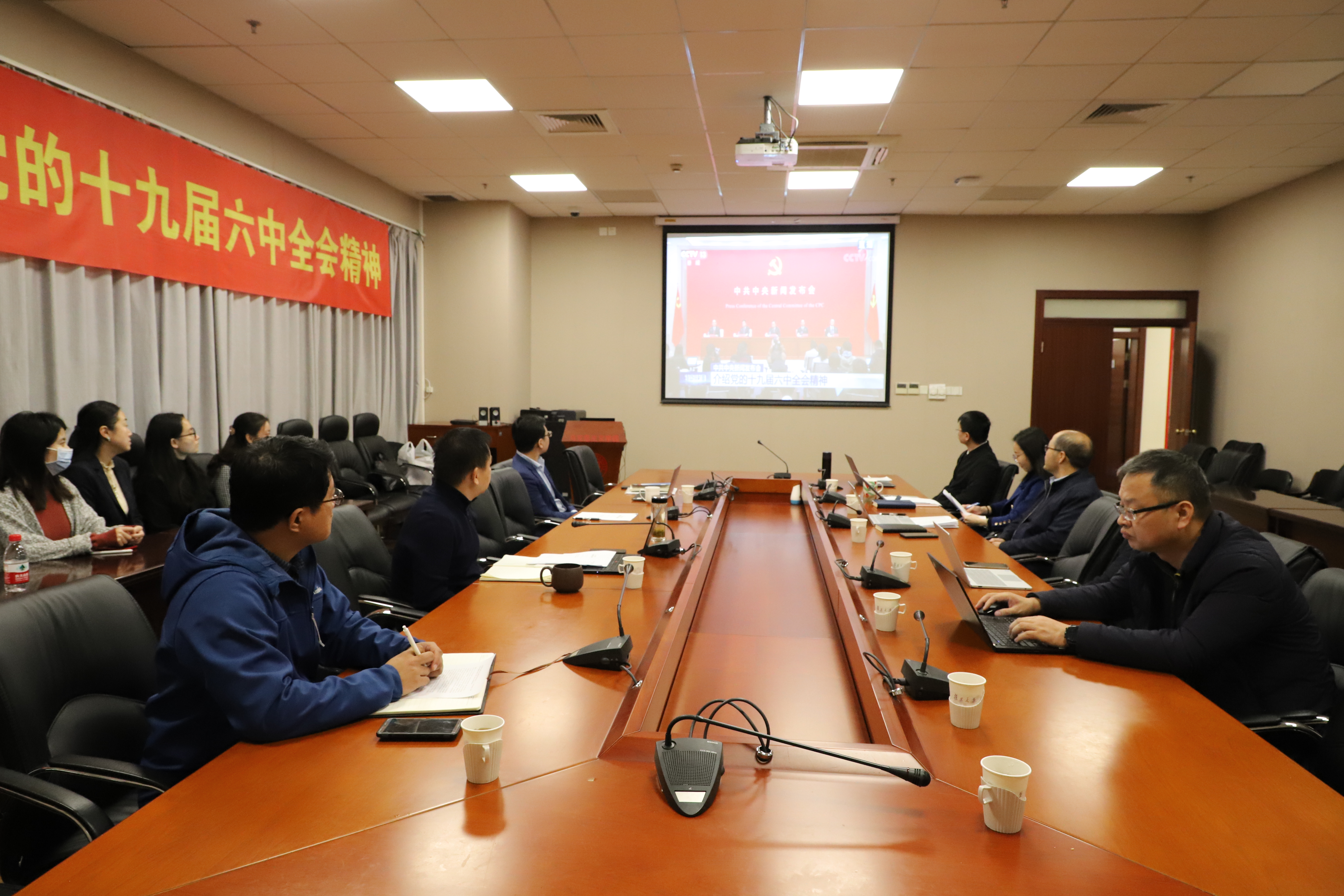 202111月8日至11日,中国共产党第十九届中央委员会第六次全体会议胜利举行。12日上午,中共中央就党的十九届六中全会精神举行新闻发布会。学院党委积极动员部署,组织师生集中收听收看了新闻发布会。