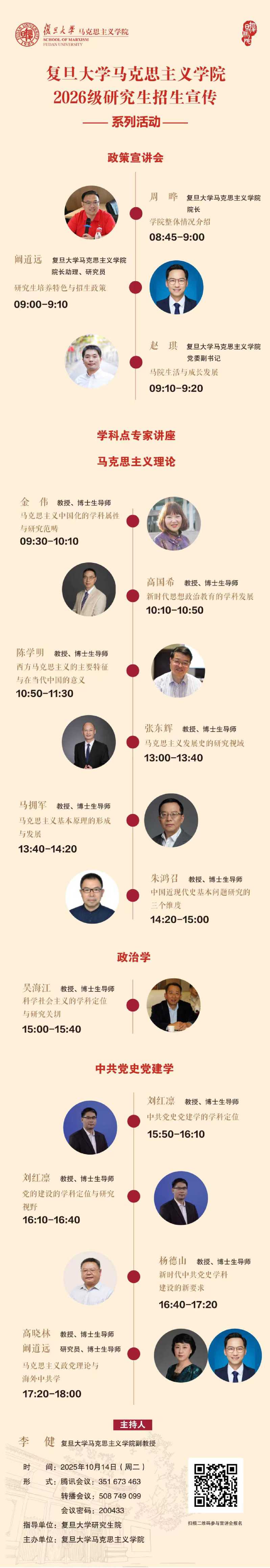 为帮助大家更全面地了解色情网 学科建设与研究动态,特邀请相关负责人及各学科点专家举办招生宣传系列活动。本次宣讲主要面向有意报考2026 级博(硕)士研究生的同学,诚邀 色情网 及全国马克思主义理论、中共党史党建学、科学社会主义与国际共产主义运动及相关学科(包括但不限于哲学、政治学、经济学、管理学、历史学、法学、社会学、文学、国家安全等)的优秀学子积极参与!