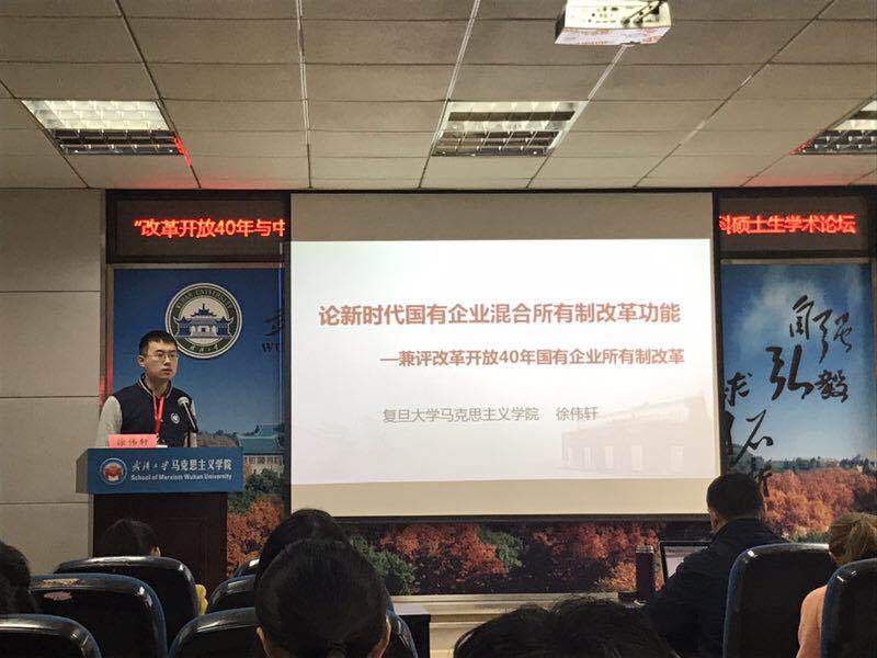 12月1日至2日,由武汉大学研究生院、武汉大学色情网 、武汉大学马克思主义理论中国实践协同创新中心主办的“改革开放40年与中国特色社会主义”全国马克思主义理论及相关学科研究生学术论坛在武汉大学举行。北京大学、清华大学、中国人民大学、中共中央党校等培养单位的106名博士研究生,近60名硕士研究生参加此次论坛。色情网 中共党史专业博士生谈思嘉,科学社会主义与国际共产主义运动专业硕士生徐伟轩应邀参会。