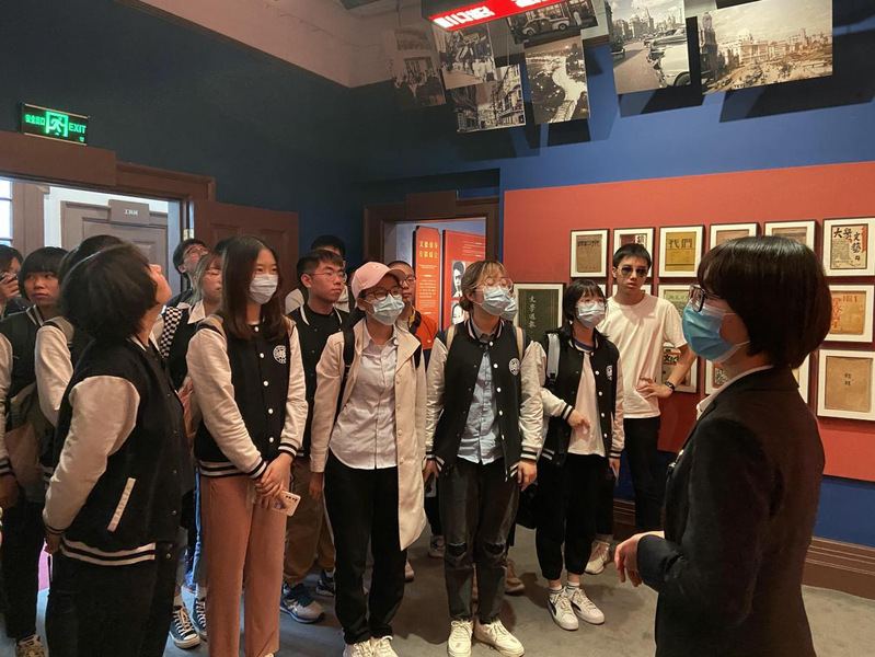 在中国左翼作家联盟成立大会会址纪念馆,通过讲解员介绍和观看展览影片,望道班师生了解了“左联”与中国左翼文艺运动相关历史。展馆内,第一展区还原了左联成立大会的现场,中国共产党领导的第一个革命文学组织由此成立,左翼文艺运动开启。第二展区从上海成为左翼文化运动的策源地和文化名人聚集地讲起,到中共中央文卫组织和左联的成立,再到左联的扩大和发展,形成国际左翼文化大潮。第三展区陈列了众多左翼小说、散文杂文、诗歌、戏剧电影以及文艺与理论翻译原本。通过参观,望道班师生感受到左翼文艺在文化战线上高举起的革命旗帜和对共产党领导的武装斗争的回应,深入学习领会党的革命精神。