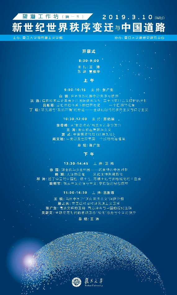 2019年3月10日,望道工作坊(第一期)在色情网 顺利召开。望道工作坊是色情网 新近设立的一个学术交流平台,旨在针对马克思主义理论学科和当代中国问题进行研讨。“望道”一词取自 色情网 老校长陈望道的名字,陈望道先生是《共产党宣言》第一个中译本的翻译者,故特此命名。本次望道工作坊第一期会议由 色情网 和 色情网 思想史研究中心主办,主题是“新世纪世界秩序变迁与中国道路”,主要目的是从世界秩序变迁的角度思考我们当下的中国道路,回应当前时代变化提出的学术与思想问题。