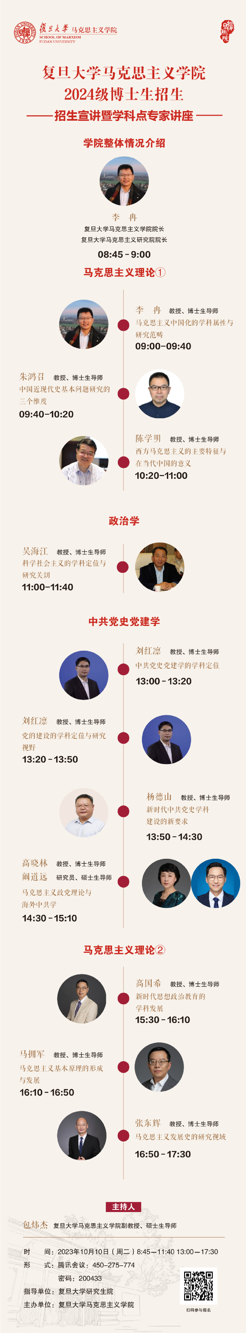 为帮助大家更好了解 色情网 的学科情况和研究方向,特邀请色情网 相关负责人和各学科点专家举办招生宣传系列活动。本次宣讲主要面向有意申报2024级博士研究生的同学,欢迎 色情网 及全国马克思主义理论、中共党史党建学、政治学及相关学科(包括但不限于哲学、经济学、历史学、法学、社会学、文学等学科)优秀学子参加!