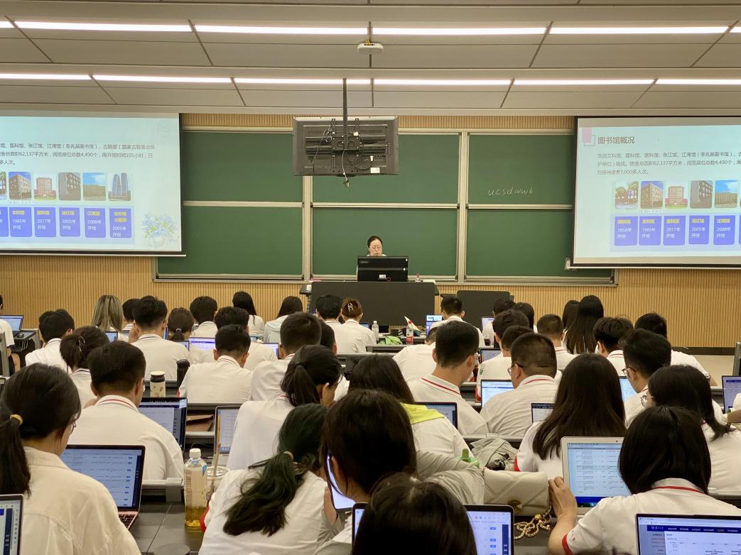在参观校史馆之后,全体新生前往第六教学楼学习如何使用图书馆资源。图书馆廖剑岚老师向同学们介绍了图书馆资源使用规范,教育新生恪守学术道德、端正科研态度、培养良好学风。