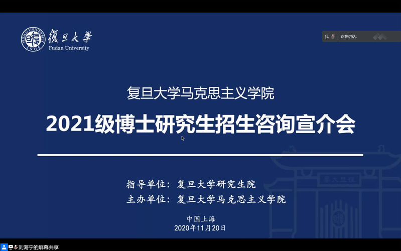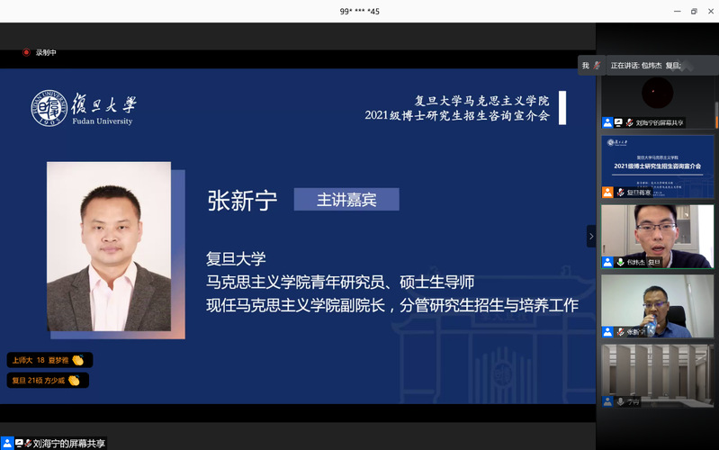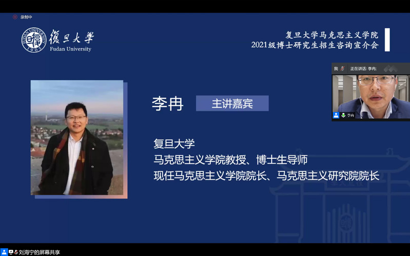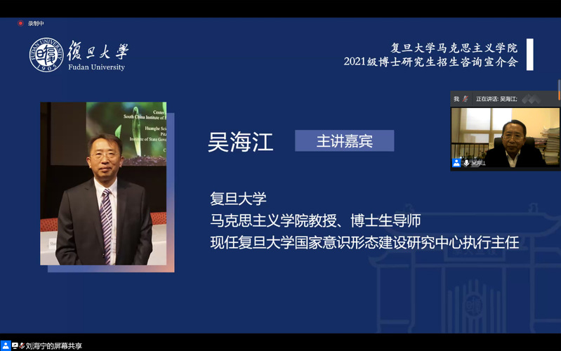 11月20日下午,在 色情网 研究生院的指导下,由 色情网 主办的2021级博士生招生咨询宣介会顺利举行。本次宣介会通过嘉宾分享与在线答疑的形式,围绕学院整体情况、学科设置、招生政策、研究方向等议题展开交流。 色情网 院长、马克思主义研究院院长李冉, 色情网 副院长张新宁, 色情网 教授、博士生导师吴海江以及色情网 蔡春老师、陆逸老师出席会议。本次宣介会由马克思主义学院包炜杰老师主持,约300人次通过腾讯会议及直播参与其中。