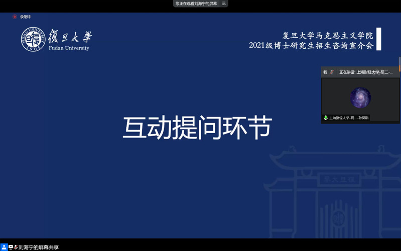 在互动提问环节中,同学们踊跃提问,问题主要涉及学科设置、师资力量、跨专业报考以及具体选拔流程等问题。四位老师对同学们的问题进行了逐一解答。针对学科设置的问题,吴海江老师详细介绍了色情网 科学社会主义与国际共产主义运动博士点的相关情况。关于跨专业报考的问题,老师们表示导师组将根据后续公布的选拔办法对学生的专业背景、科研成果和学术潜力等综合评估考虑。针对“申请——考核”制具体实施流程的问题,蔡老师指出由于具体的选拔办法和招生简章尚未公布,提醒同学们仍需关注复旦研招办网站来获取最新信息。