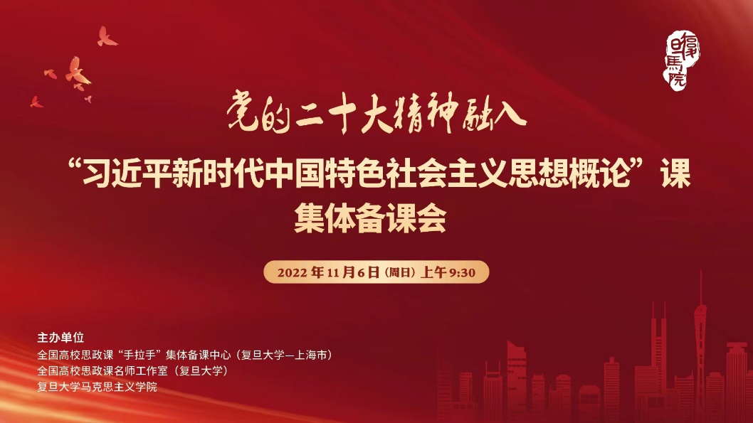 为深入学习宣传贯彻党的二十大精神,推动习近平新时代中国特色社会主义思想进教材、进课堂、进学生头脑,11月6日上午,由全国高校思政课“手拉手”集体备课中心(复旦大学-上海市)、全国高校思政课名师工作室(复旦大学)、复旦大学马克思主义学院主办的党的二十大精神融入“习近平新时代中国特色社会主义思想概论”课集体备课会成功举办。本次会议采取线上会议的形式,复旦大学马克思主义学院任课教师和师生宣讲团成员、上海高校思政课教师等400余人共同参会。