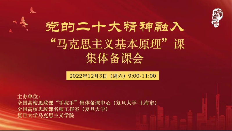 为深入学习贯彻党的二十大精神,推动习近平新时代中国特色社会主义思想进教材、进课堂、进学生头脑,12月3日上午,由全国高校思政课“手拉手”集体备课中心(复旦大学-上海市)、全国高校思政课名师工作室(复旦大学)、复旦大学马克思主义学院主办的党的二十大精神融入“马克思主义基本原理”课集体备课会成功举办。本次会议采取线上会议的形式,复旦大学马克思主义学院任课教师和全国部分高校马院教师等40余人共同参会。