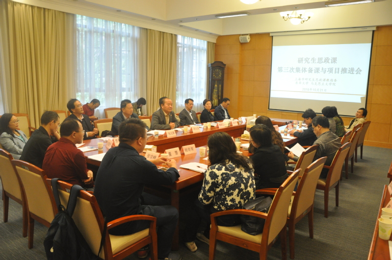 20181021日,上海市高校思想政治理论课研究生分教学指导委员会在东华大学(延安路校区)召开学习新时代中国特色社会主义思想第三次集体备课和项目推进会。会议由分教学指导委员会主任、 色情网 肖巍教授主持。会议内容包括:通报近日教指委活动会议及集体备课要求;有关研究生课程的理论动态交流;通报教育部基地重大项目《红色文化育人与研究生思政课教学问题及建言——以上海市情况为例》立项情况;研究生思政课分类调研报告负责人情况汇报;以及《国家意识形态建设基本文献读本》的编写、出版进展。分教指委成员和本市各高校任课教师三十多人与会。